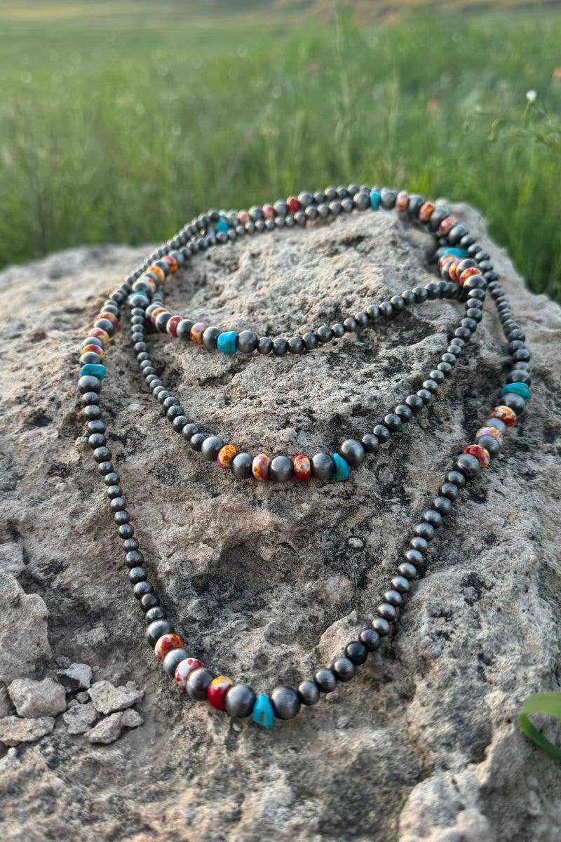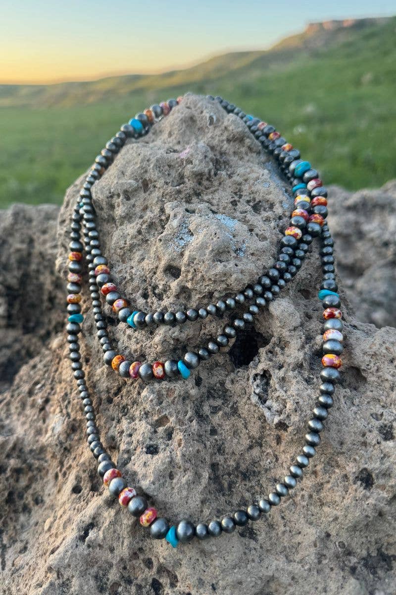 Wear your creativity with our Colorful Canyon Necklace! Each piece is versatile, allowing you to style it in various lengths and wrap it to your liking. Made of beautiful Navajo pearls, this necklace adds a cute and fun touch to any outfit. Express your unique style with this must-have accessory.