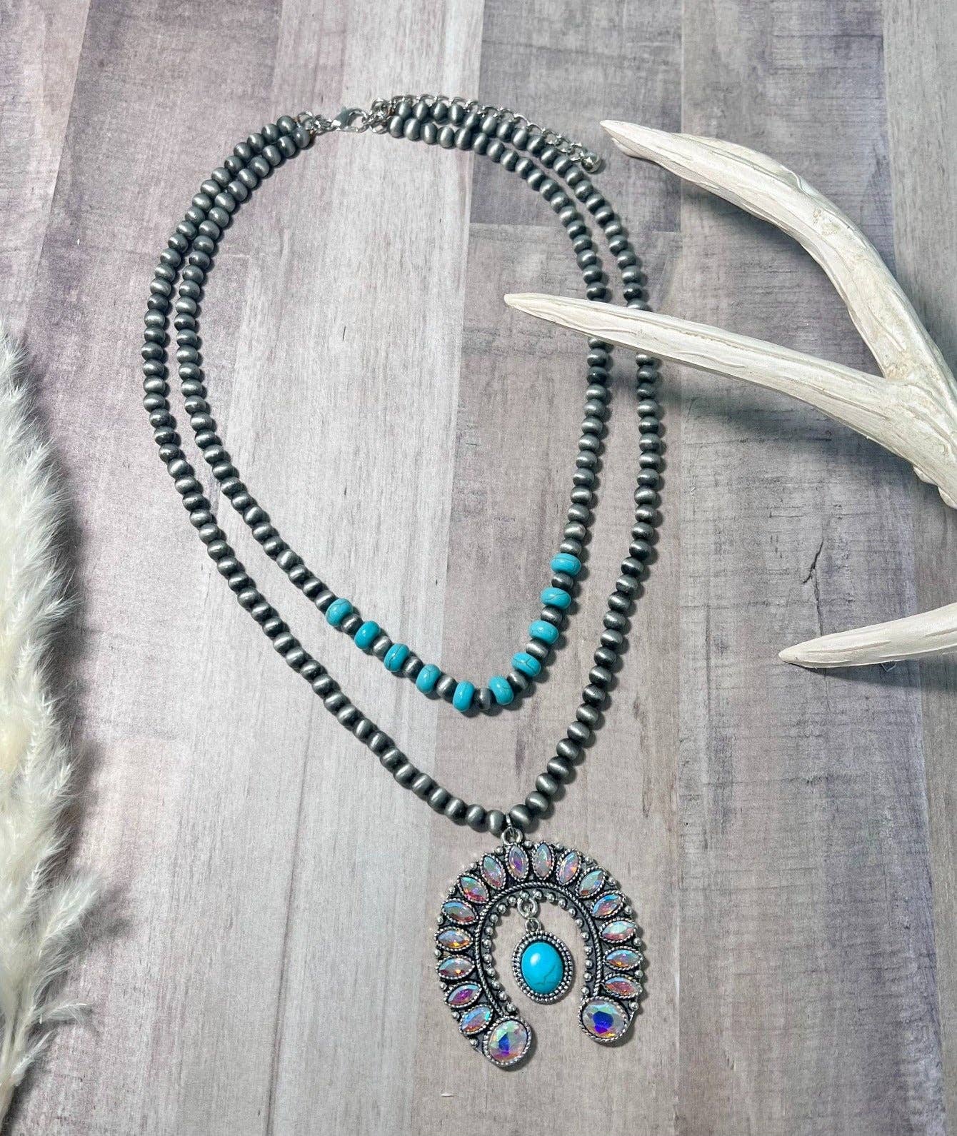 This necklace is a delicate and dainty tribute to Southwestern heritage and timeless elegance. It features intricately layered squash blossom design adding a touch of refined sophistication to any ensemble, perfect for those who appreciate understated the nostalgia of the Southwest and want to create lasting impressions with every wear.