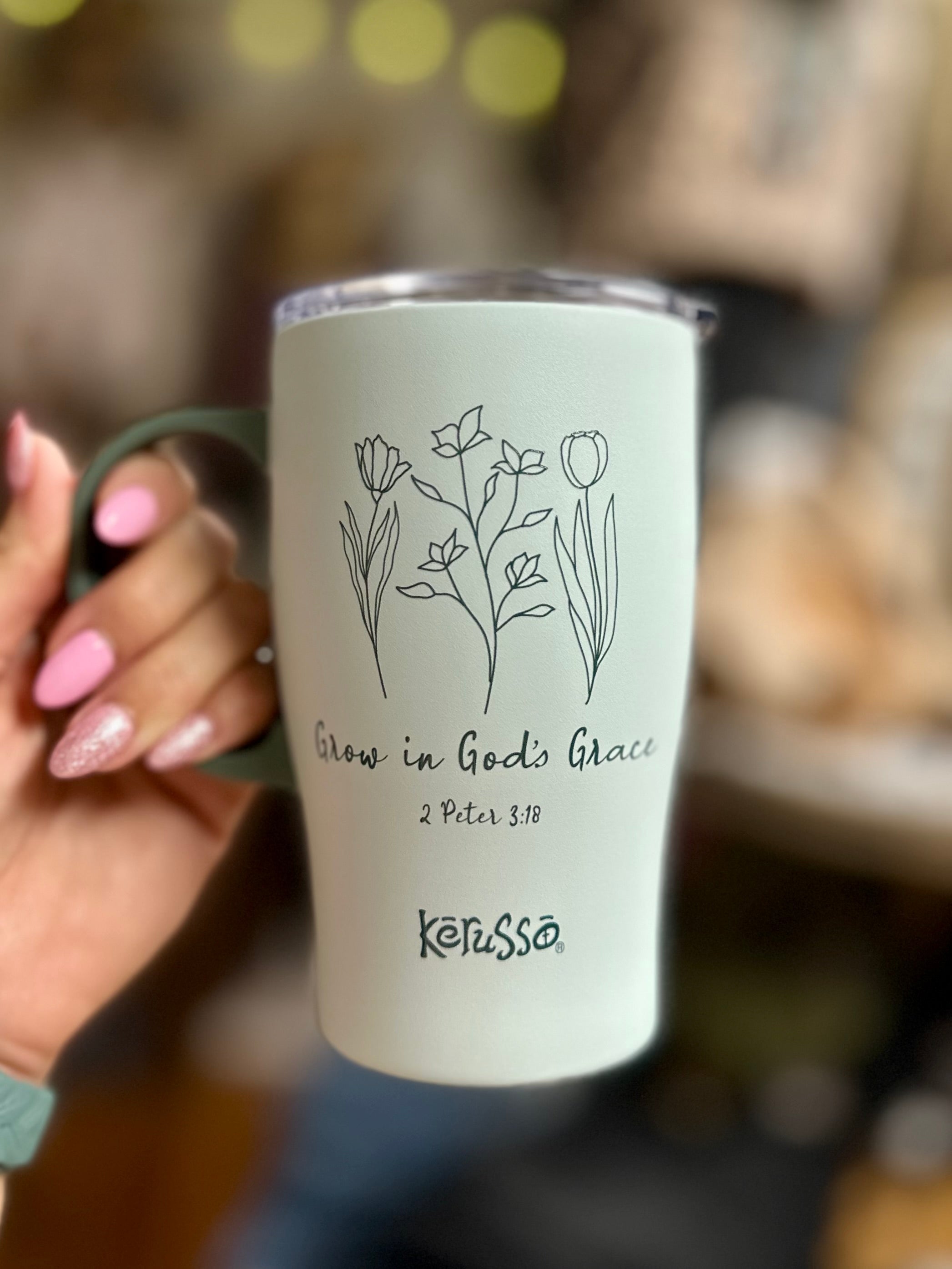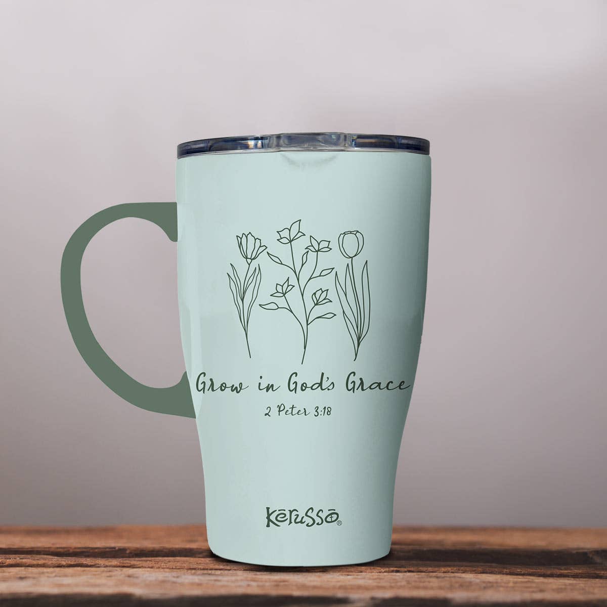 Your faith will bloom with every sip from this sweet “Grow In Grace” Kerusso® 15 oz. Stainless-Steel Mug with Handle in Green. It’s a practical vessel that keeps drinks ice-cold or piping hot for hours—perfect for home, work, or the car. Sometimes stormy weather or dry spells are what it takes for us to grow; we serve a good God who knows exactly what He’s doing, and has a plan for our lives.