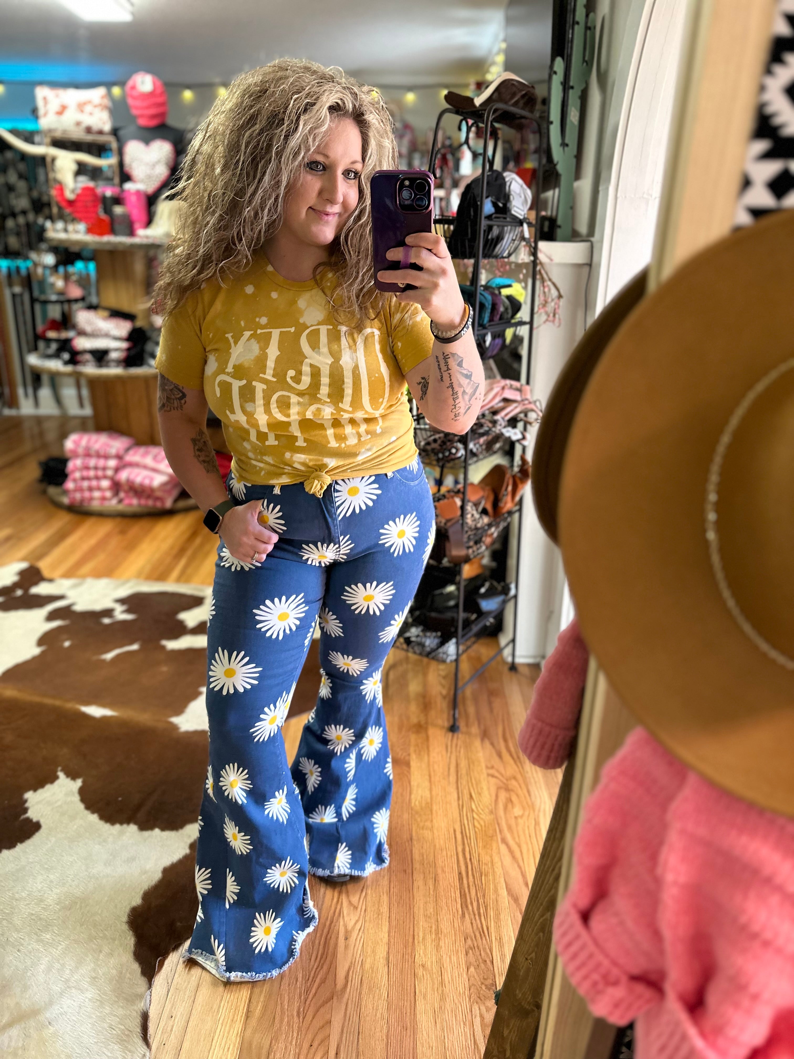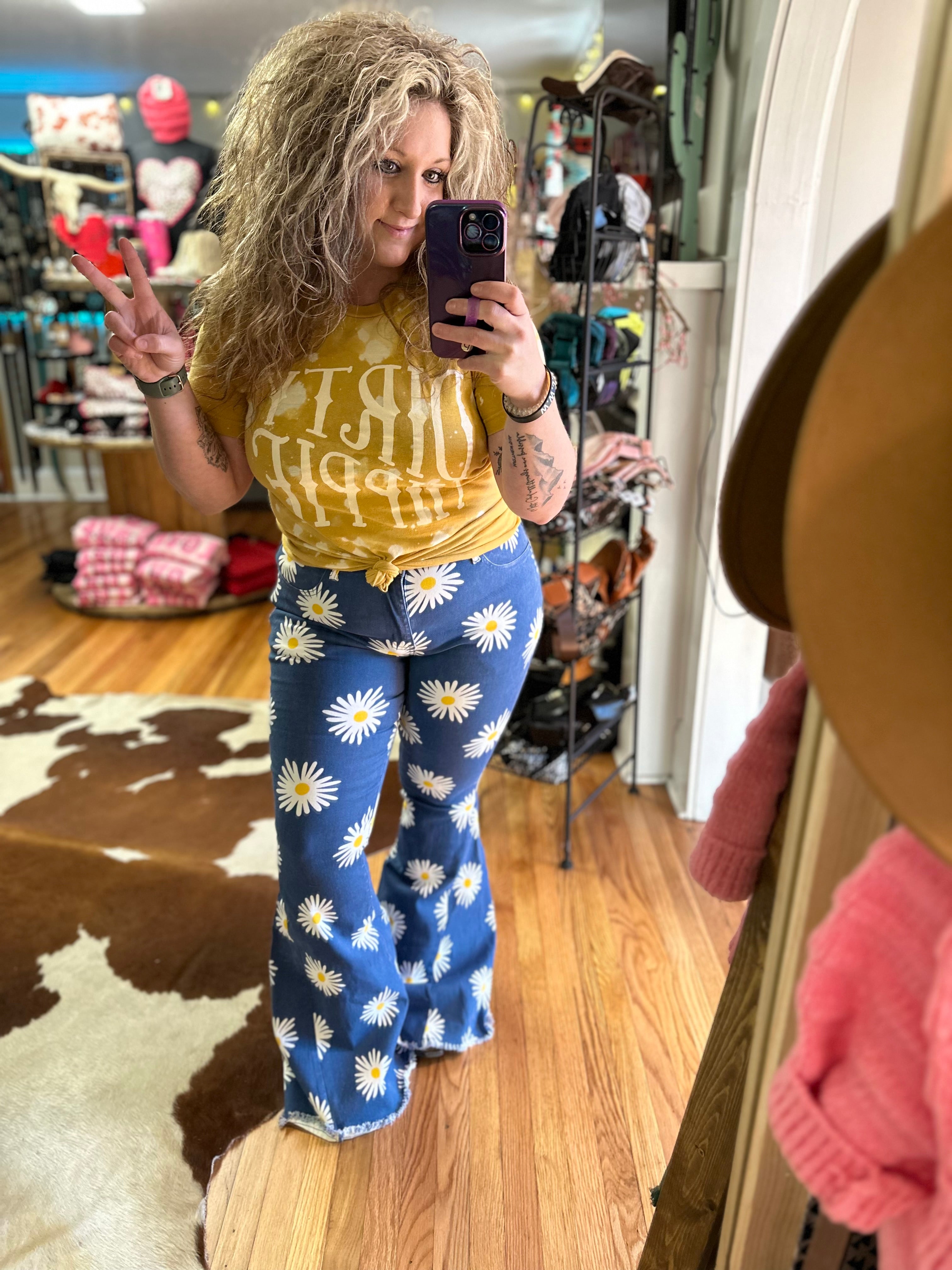 Find your inner flower child in these daisy bell bottom blue jeans. These bells will surely bring a smile to your face and spread happiness everywhere you go!