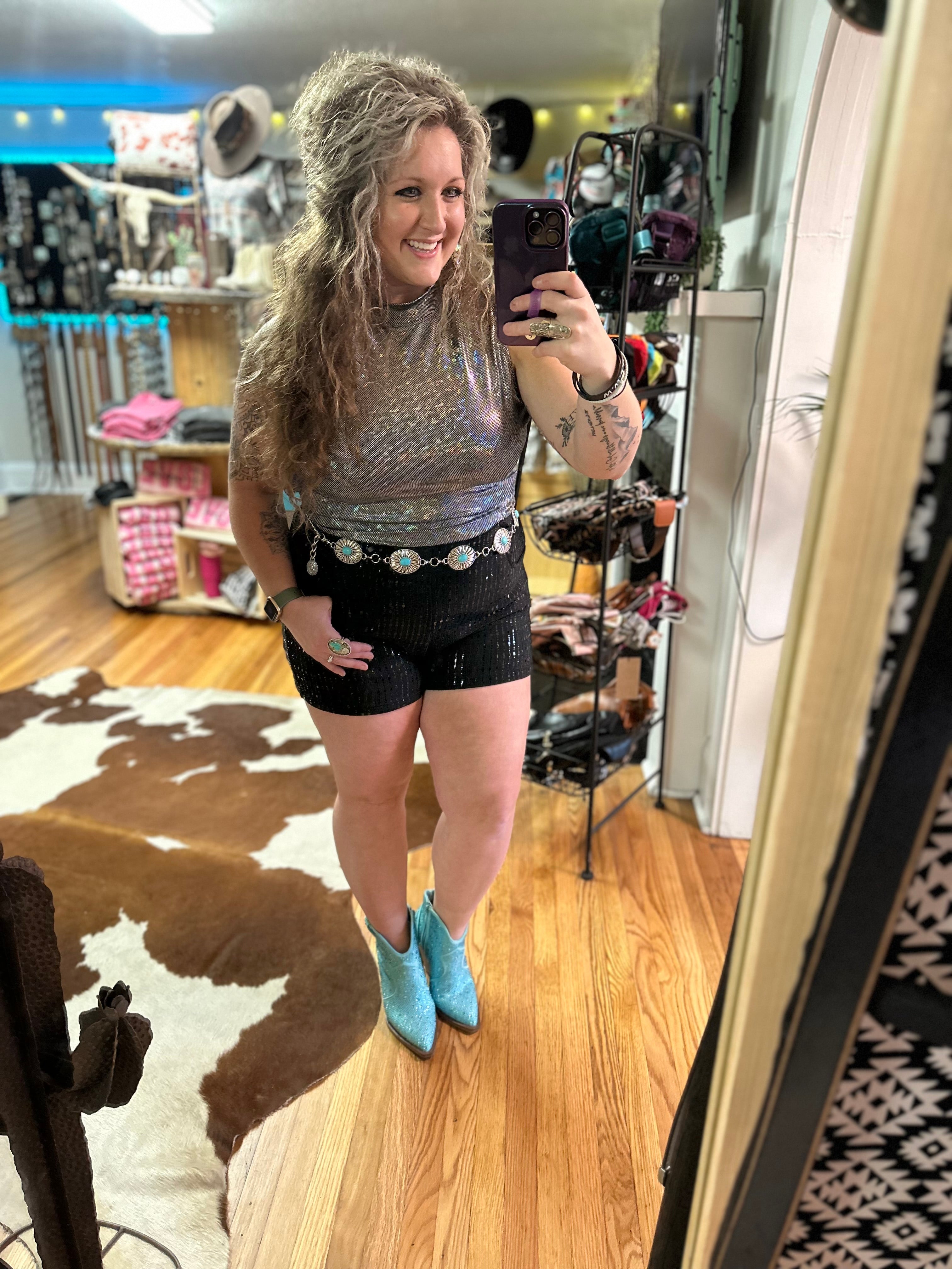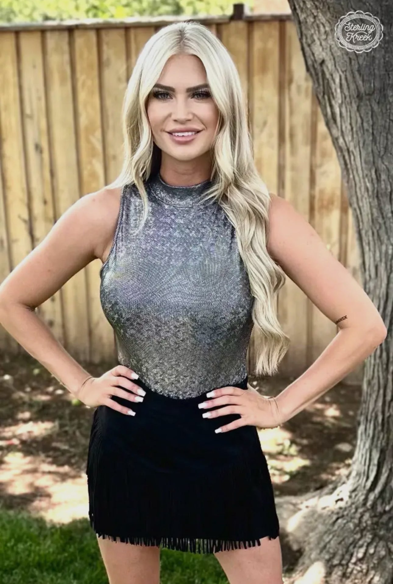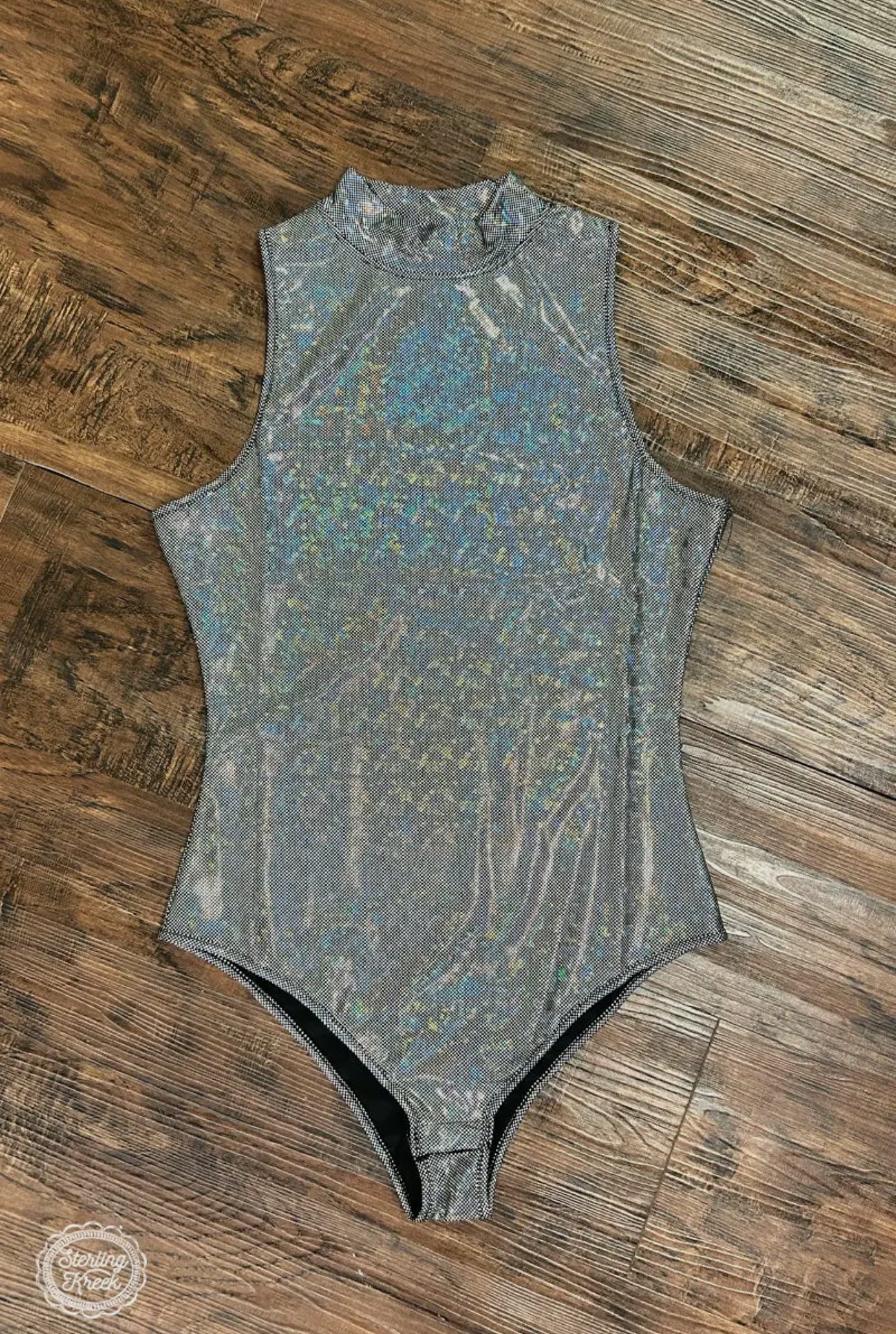 Shine like the sun in the Ace High Bodysuit!! This silver-plated tank top is sure to turn heads with its high collar and metallic sheen. Perfect for a night out, be the talk of the town in this bodacious bodysuit!