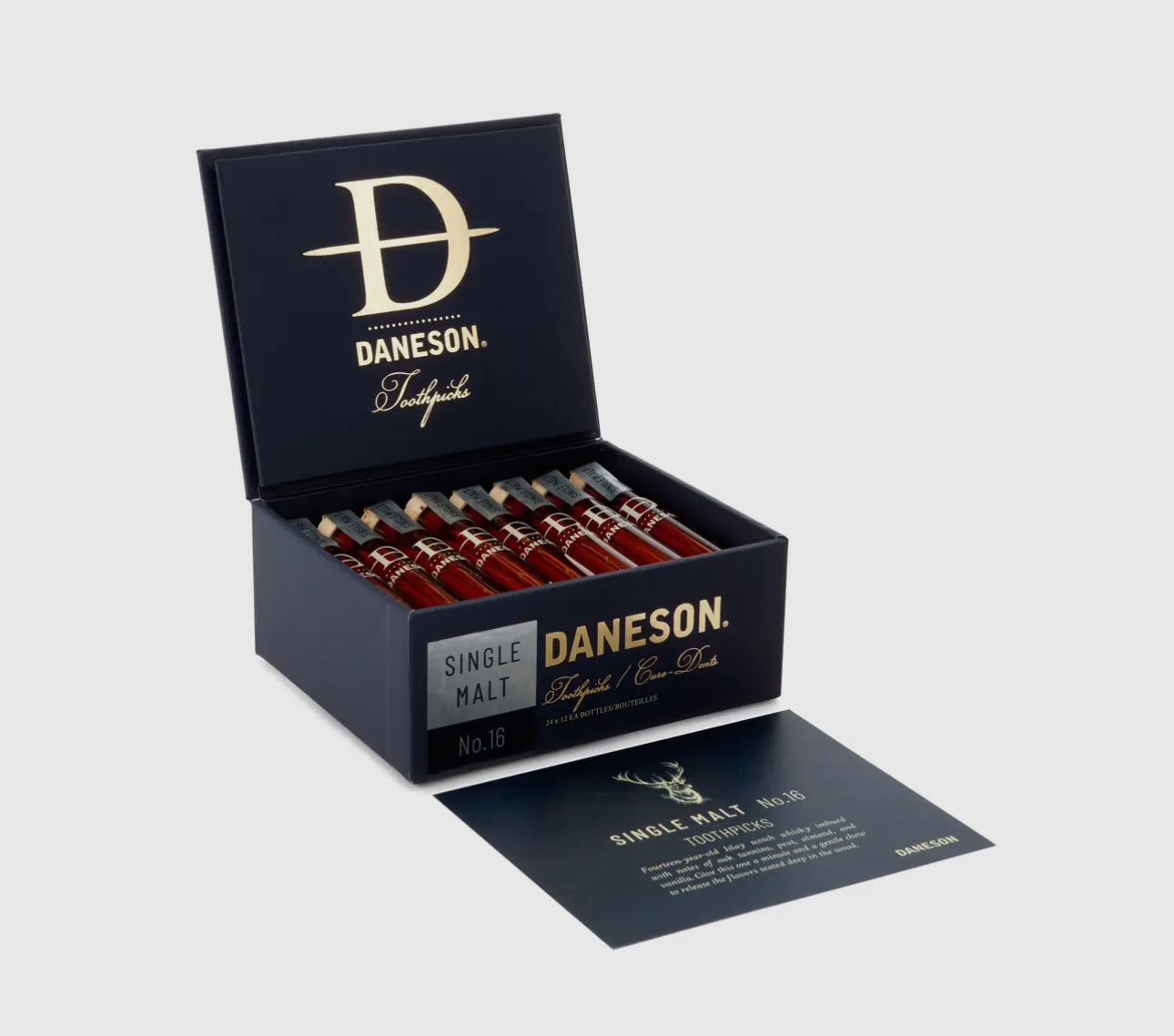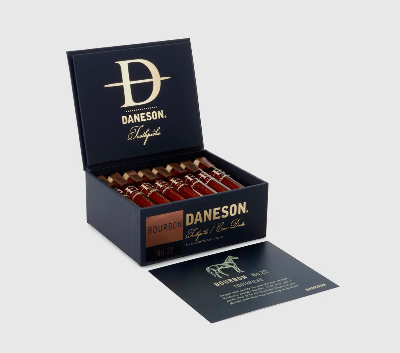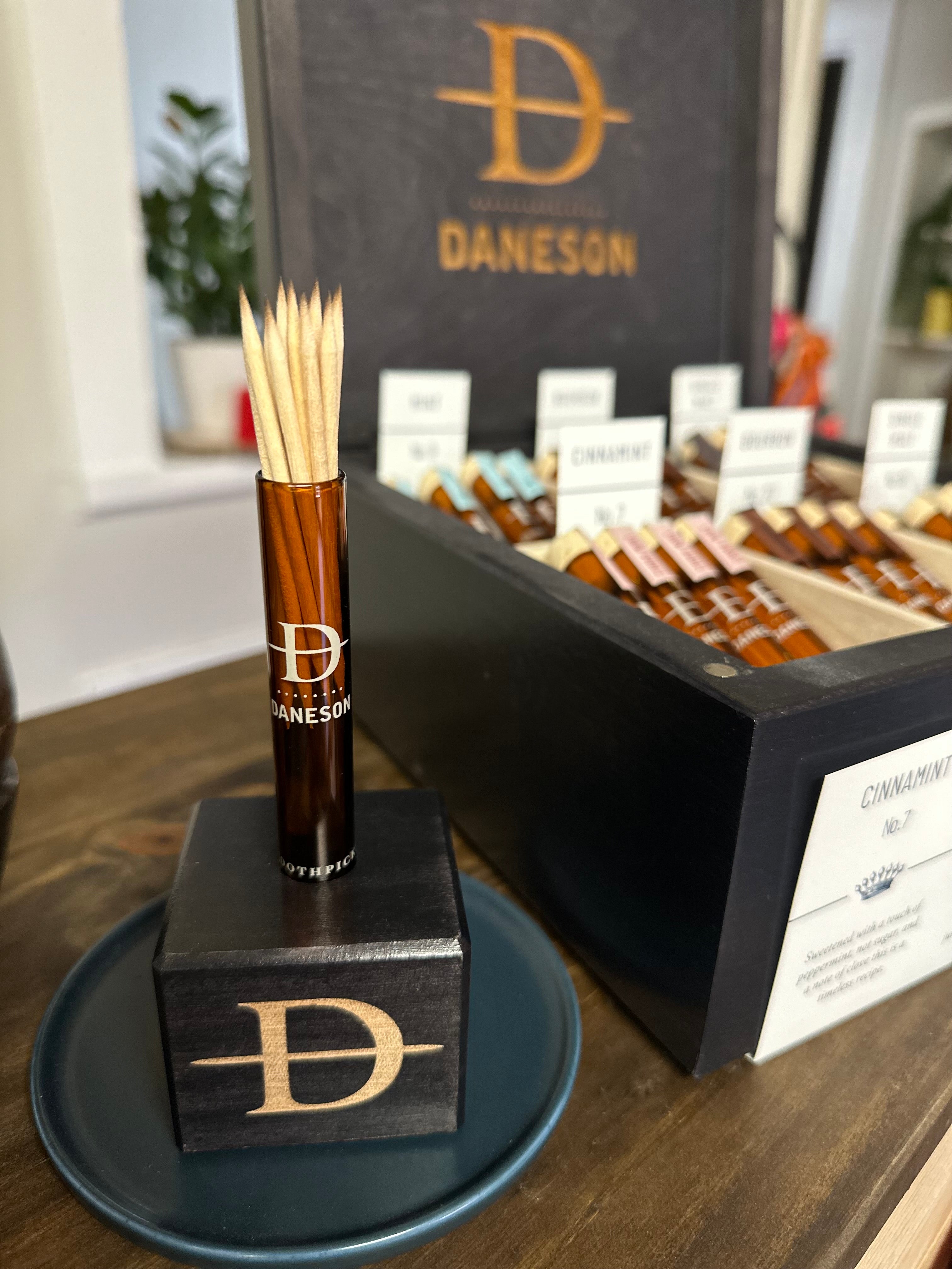 Daneson Toothpicks will become your new favorite must have. These are not just any ole toothpicks but ones made with extreme attention to detail and quality. From up north, this family owned company makes the toothpicks from bone white - American milled - northern white birch trees. They are then infused with a top shelf whiskey and bourbon.