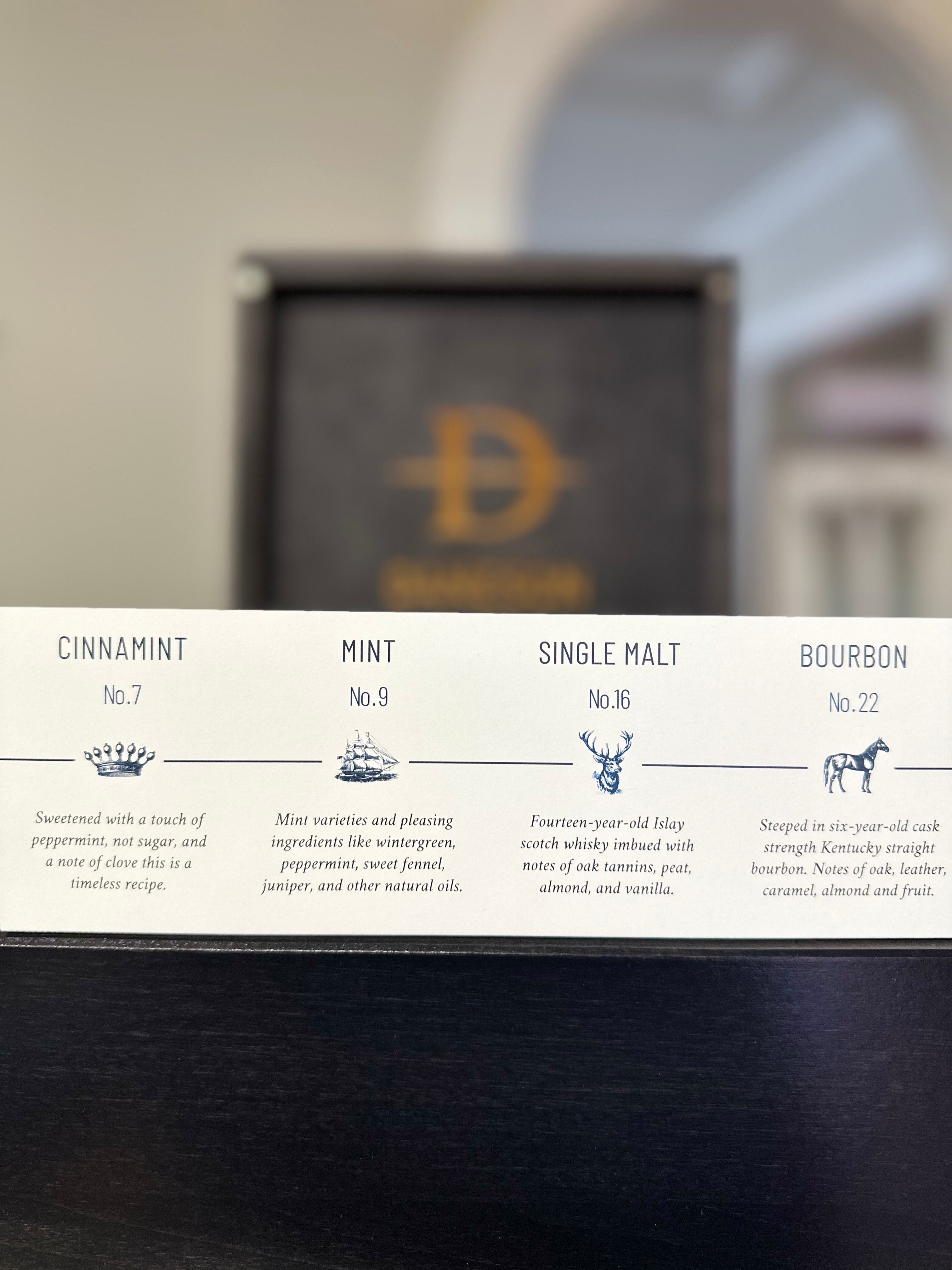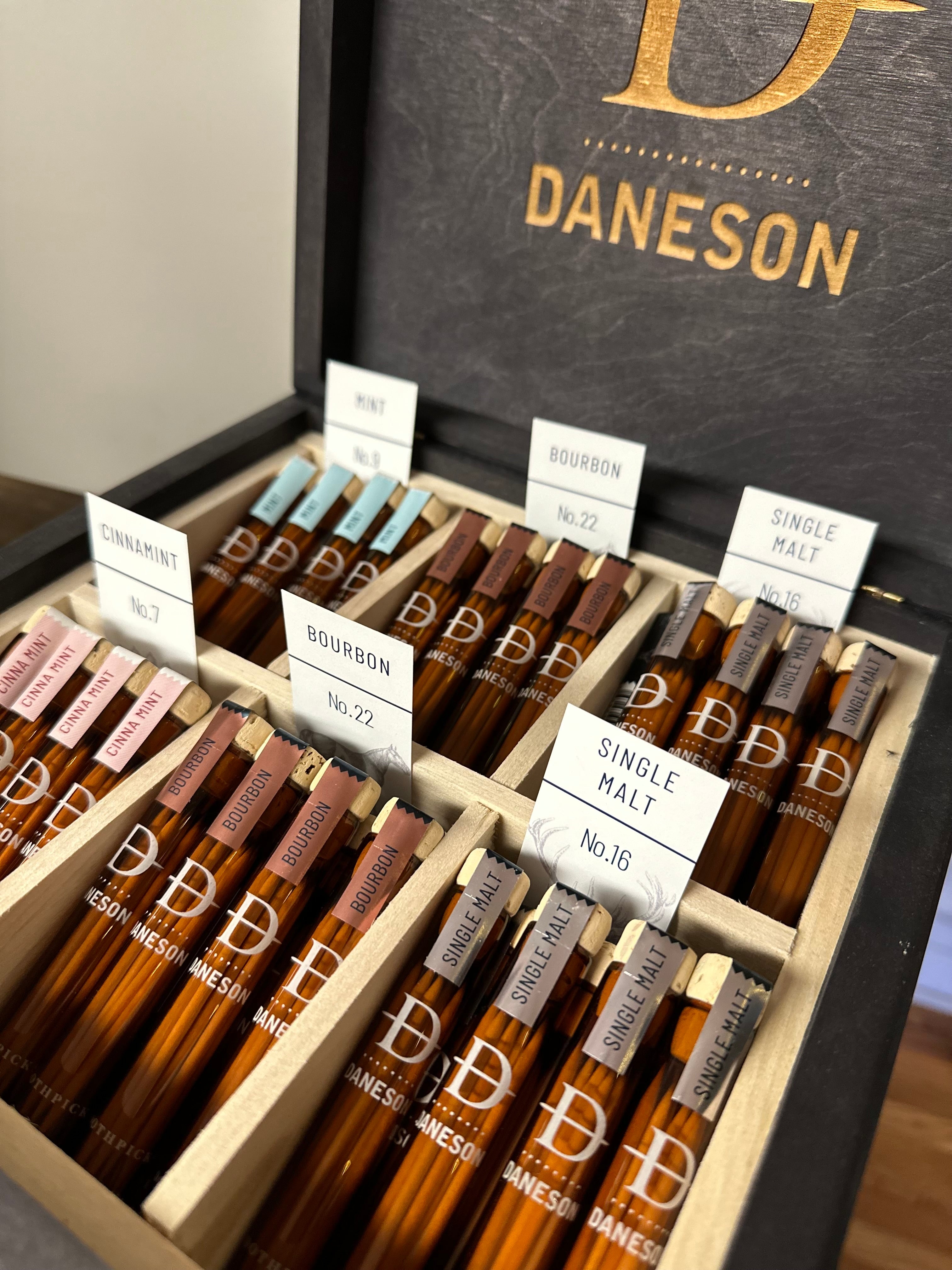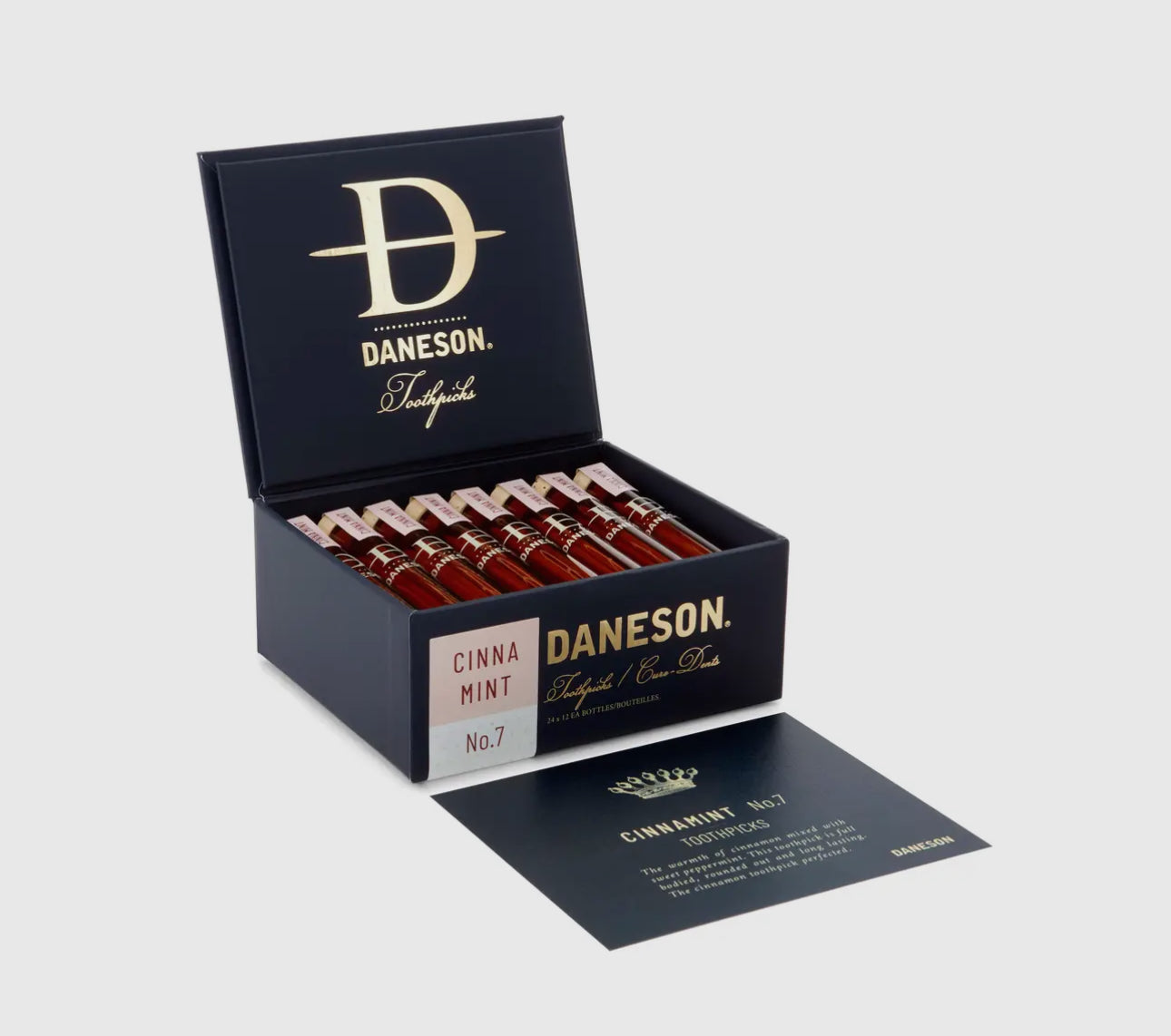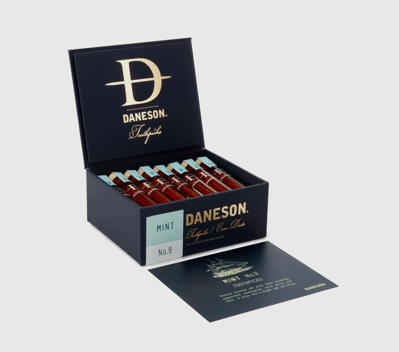 Daneson Toothpicks will become your new favorite must have. These are not just any ole toothpicks but ones made with extreme attention to detail and quality. From up north, this family owned company makes the toothpicks from bone white - American milled - northern white birch trees. They are then infused with a top shelf whiskey and bourbon.
