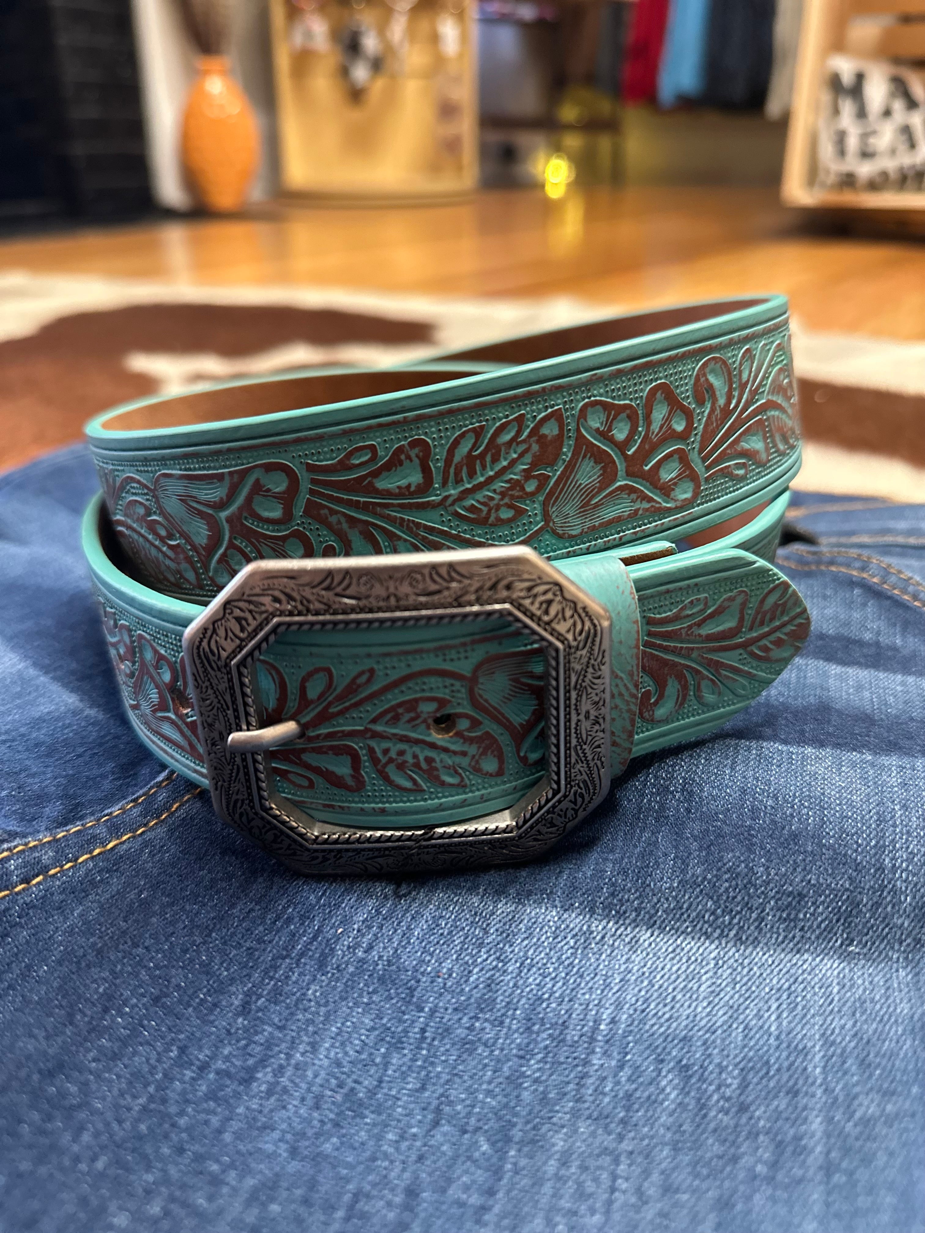 Western Hand Painted Tooled Leather Turquoise Belt