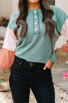 Bring a splash of desert sunset to your everyday style with the Painted Desert Henley. Featuring a textured corded knit in a cool teal body and color-blocked sleeves in warm shades of blush, coral, and sand, this oversized top is the perfect blend of cozy and eye-catching. The button-up neckline adds a touch of classic henley charm, while the relaxed fit makes it an easy choice for laid-back days or casual nights out.