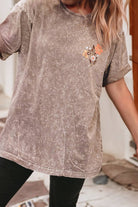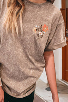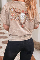 Saddle up in style with this mineral-washed, dusty rose tee featuring a bold, floral longhorn graphic. The soft, vintage-inspired wash gives it that perfectly worn-in feel, while the warm desert tones and intricate floral details add a touch of cowgirl charm. Pairs effortlessly with your favorite denim, boots, or layered under a shacket for those cooler nights on the range.