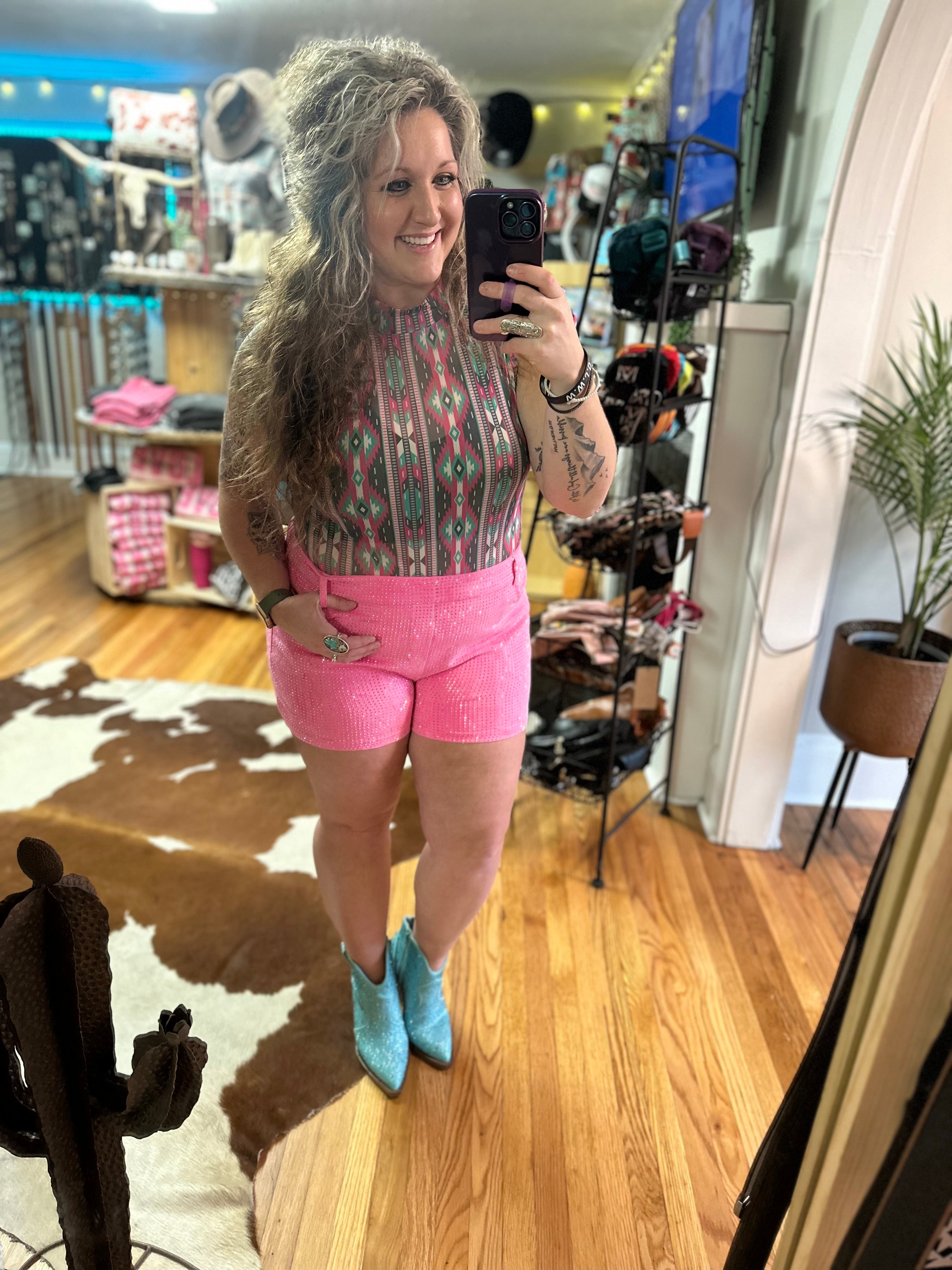 Rock out in style with these Jitterbug Shorts! These pink velvet shorts are adorned with sparkling rhinestones for a touch of glam. The elastic waistband ensures a comfortable fit, while the pockets provide added functionality. Get ready to dance the night away in these playful and chic shorts!