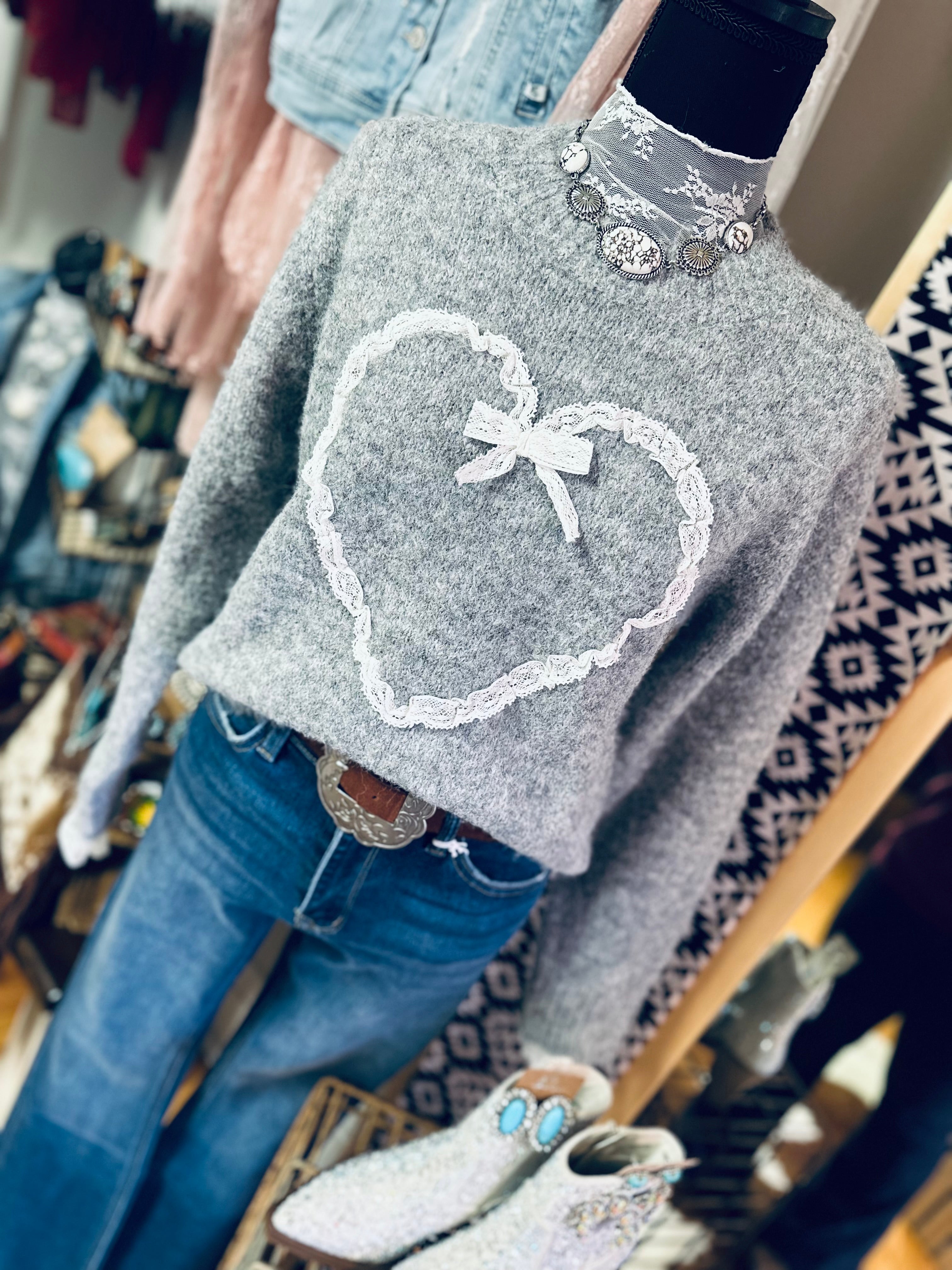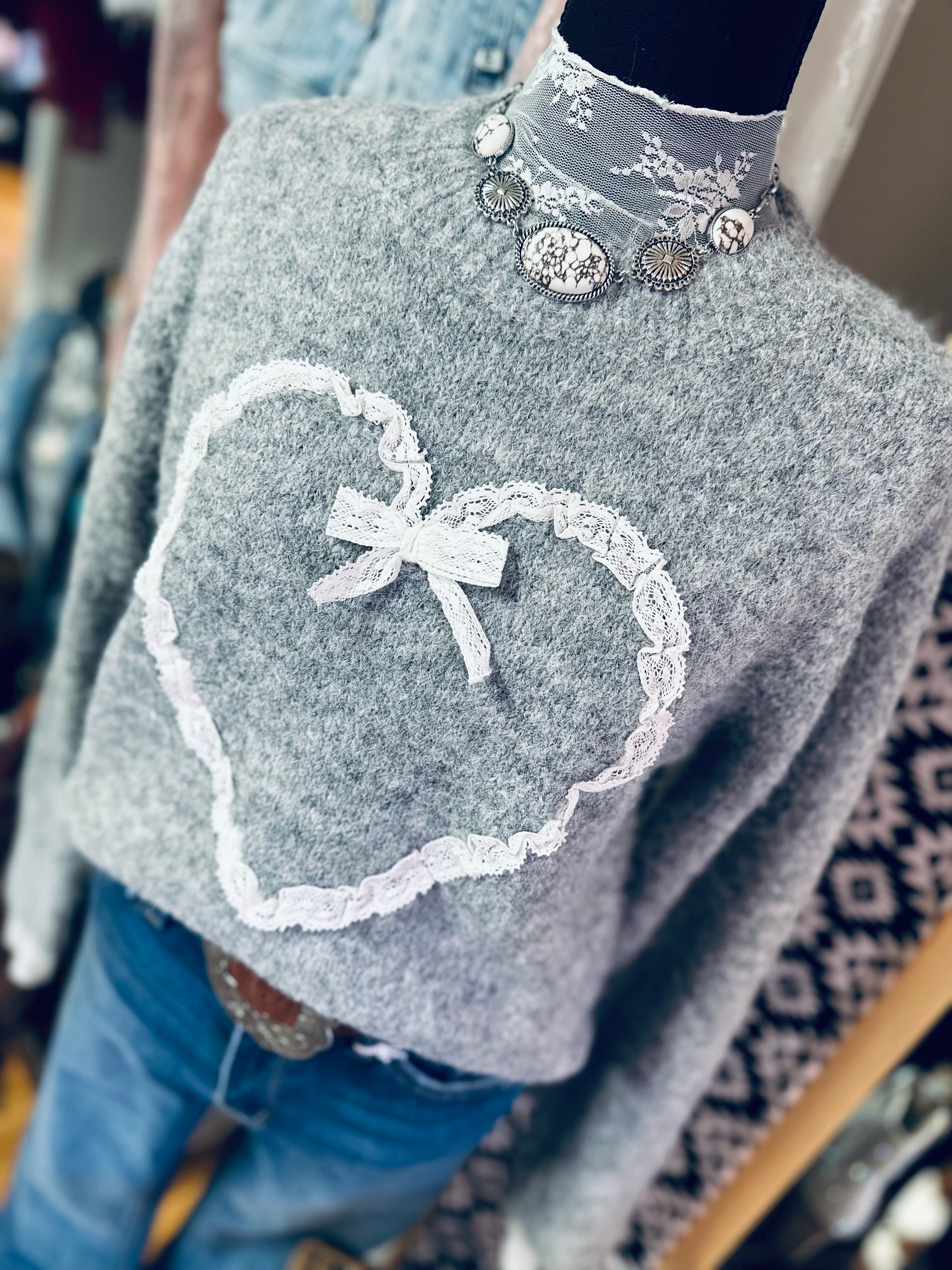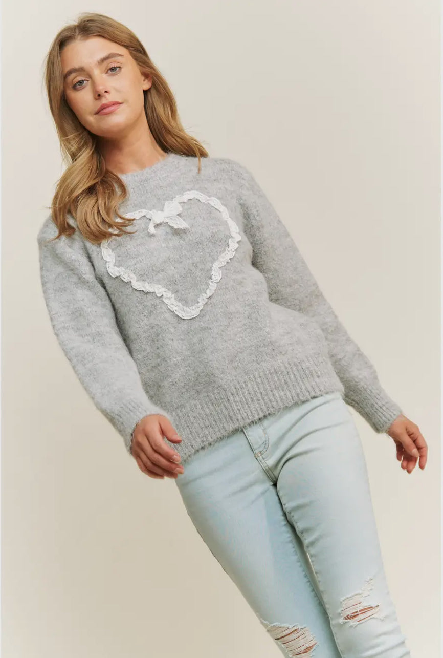 Stitched With Love will become your new favorite for these chilly days! This extremely soft and cozy sweater features an adorable lace heart stitched to perfection! Pair with jeans, leggings or a skirt, and goes perfectly with our Southern Lace Top! Go ahead girl, your closet needs her!