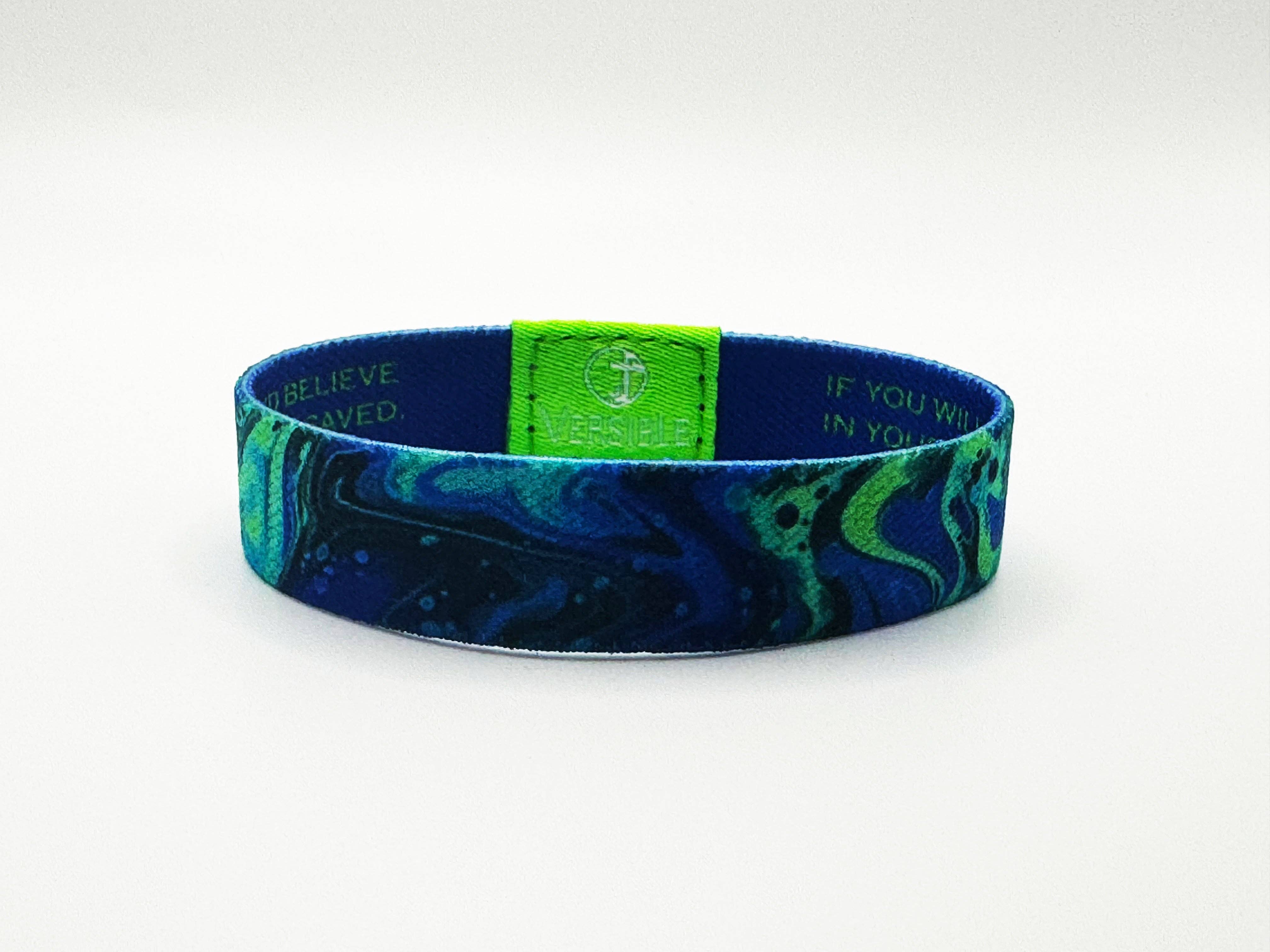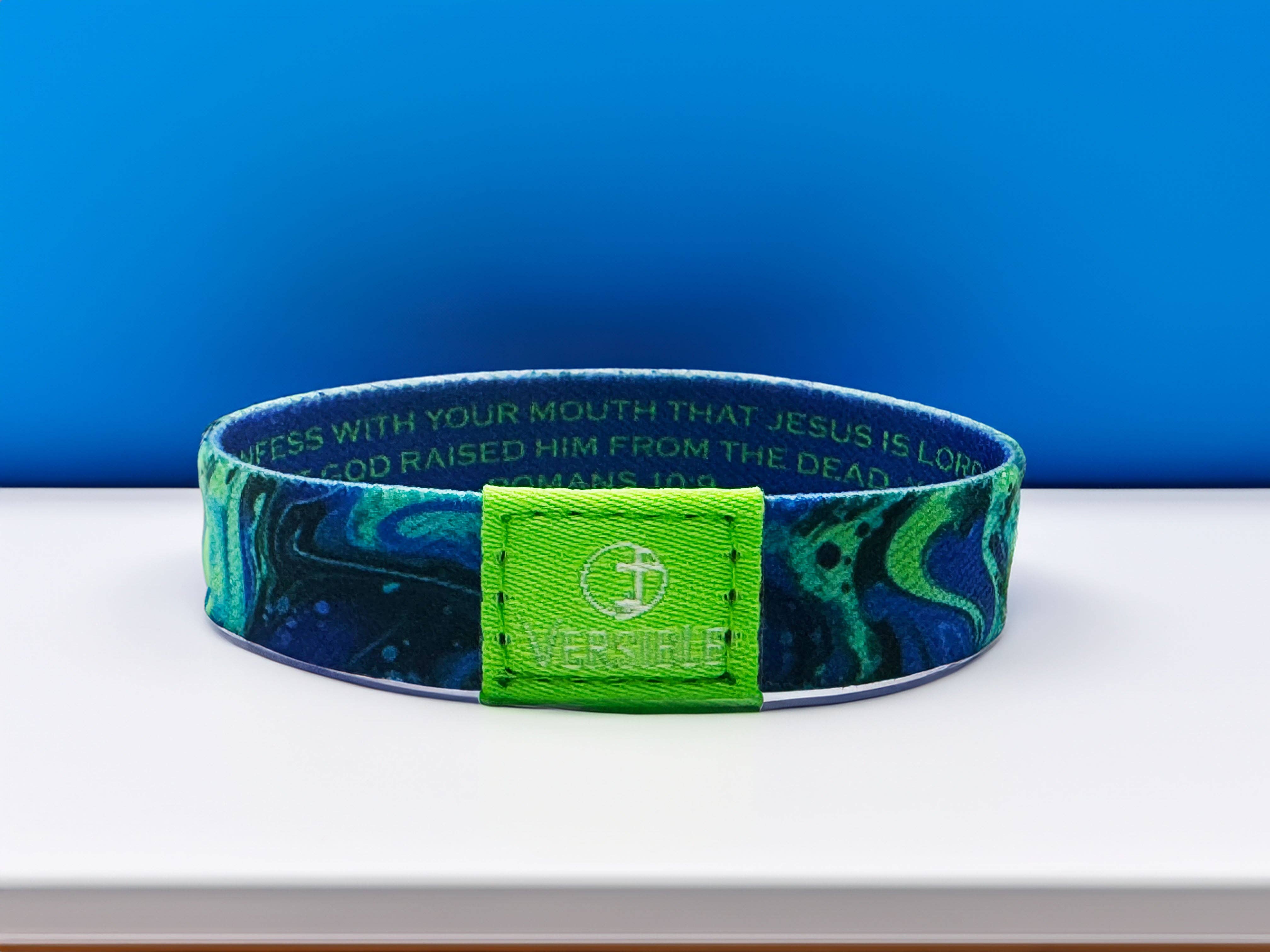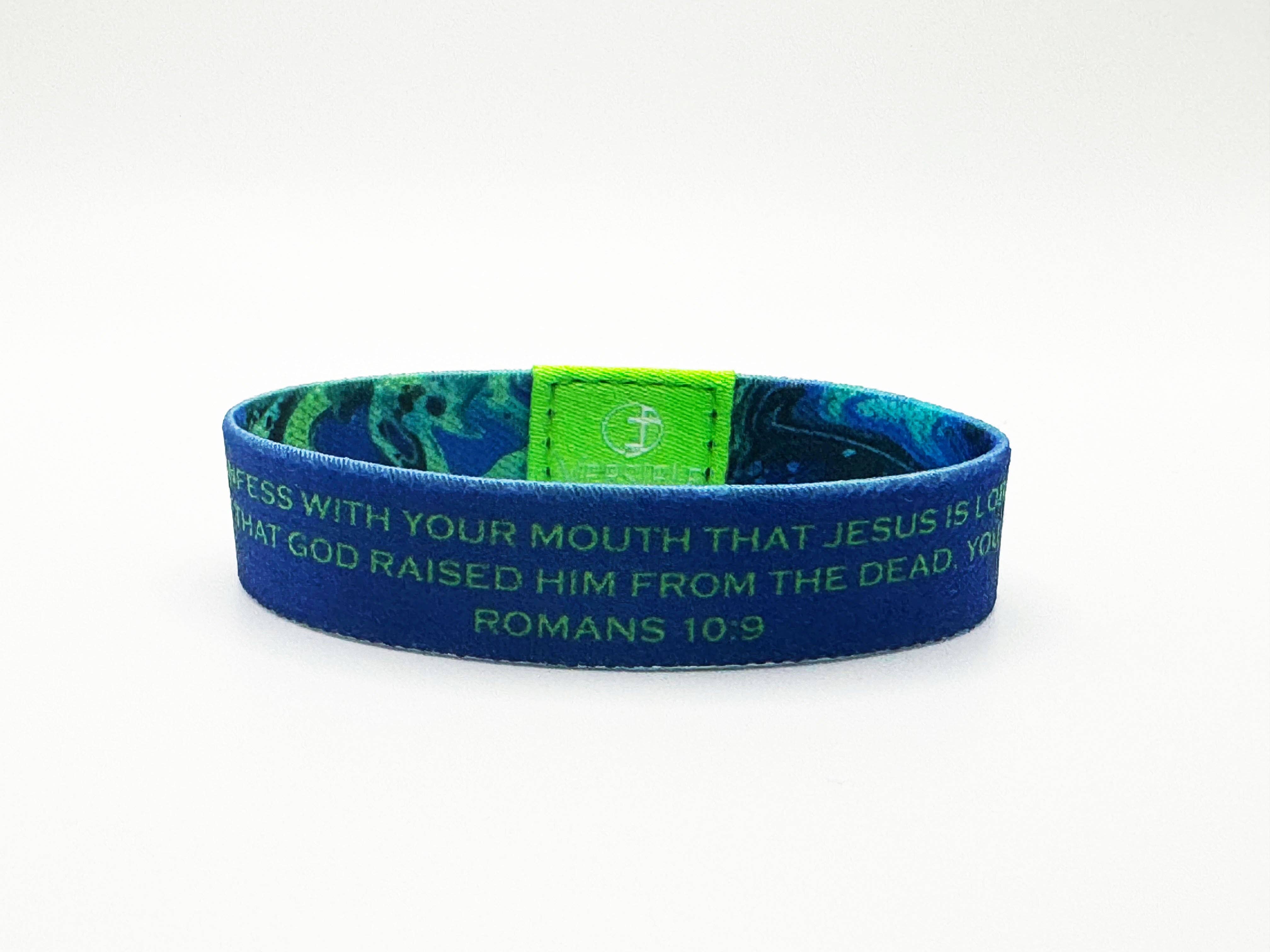 IF YOU WILL CONFESS WITH YOUR MOUTH THAT JESUS IS LORD AND BELIEVE IN YOUR HEART THAT GOD RAISED HIM FROM THE DEAD, YOU WILL BE SAVED. ROMANS 10:9 This bright design features cosmic swirls of blue and green on one side and Romans 10:9 in a royal blue field on the flip side, with God’s encouraging promise that salvation is guaranteed through Jesus. It’s an eye-catching reminder to share your faith on any occasion. * Reversible Design * Outside: Bright swirling blues & greens * Inside: Romans 10:9 on Royal Blue * Soft, Stretchy Polyester / Elastic Blend *