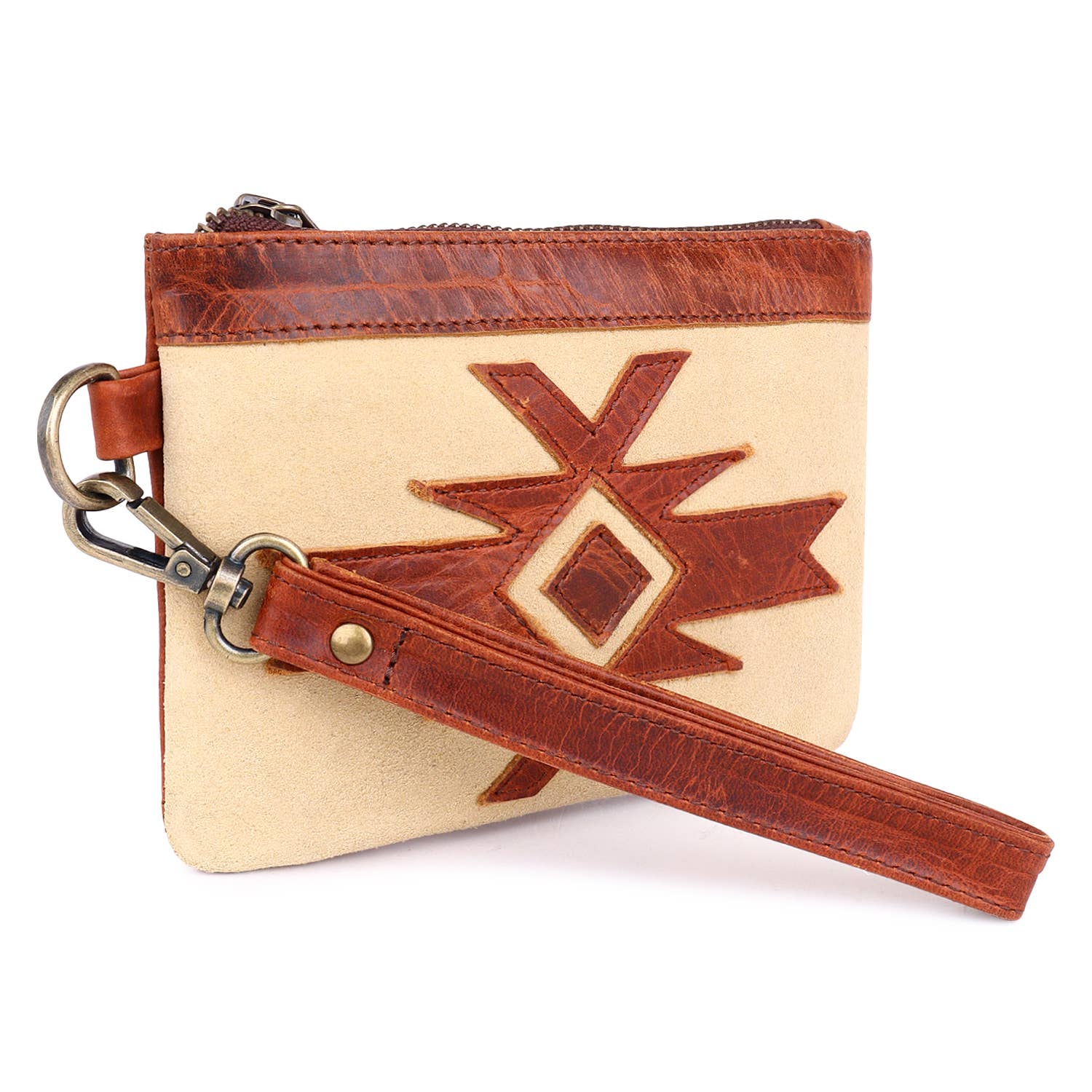 Refined simplicity meets functionality in our leather wristlet. Crafted from premium leather, it's perfect for carrying essentials with elegance. Compact yet spacious, it's your versatile companion for any outing. Material: 100% Genuine Leather and suede • Utility (Outside): Designer Front with Metal zippered compartment. • Utility (Inside): Zippered compartment • Lining: Poly Cotton Dark Brown Twill Lining • Collection: Fringe Flair • Fittings: Brass and Zinc Hardware • Dimensions ( In Inch ): 7" W x 5" H • Handle: 6" Drop • Shoulder: N/A • Closure: YKK Metal Zipper