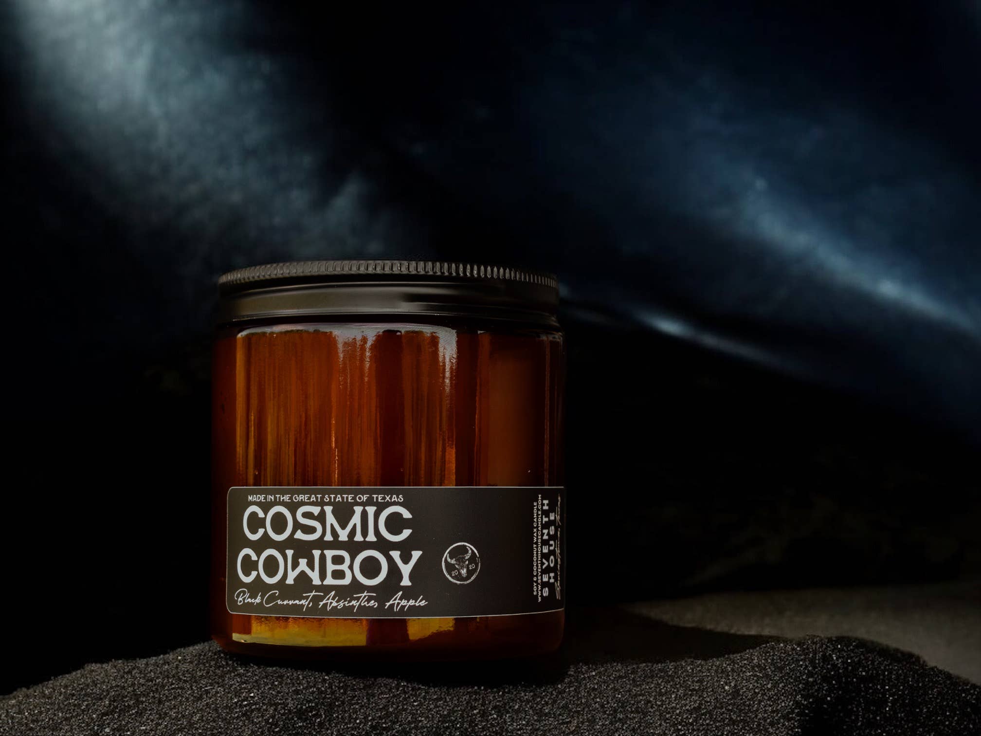 Our "Cosmic Cowboy" scent is a captivating and sensual fragrance. It begins with light traces of apple and delicate saffron threads. Luscious black currants and blackberries are the core of this fragrance. Patchouli and cedarwood essential oils enhance the intensity of the dark fruit in this rich candle.