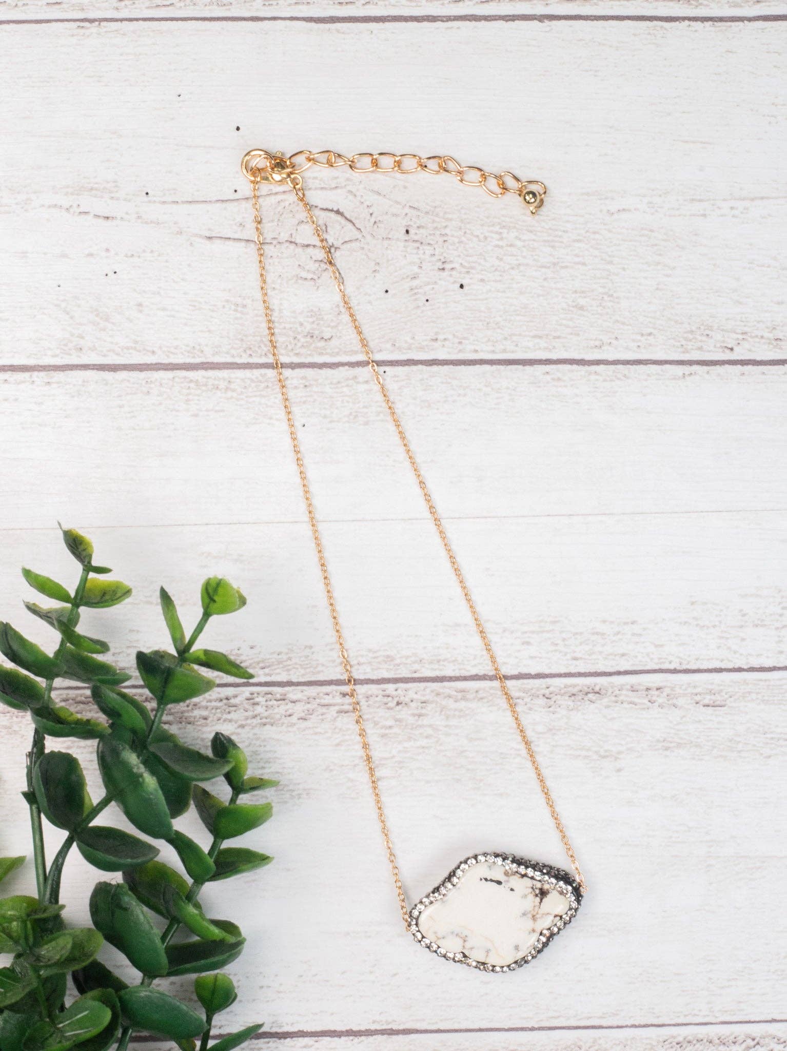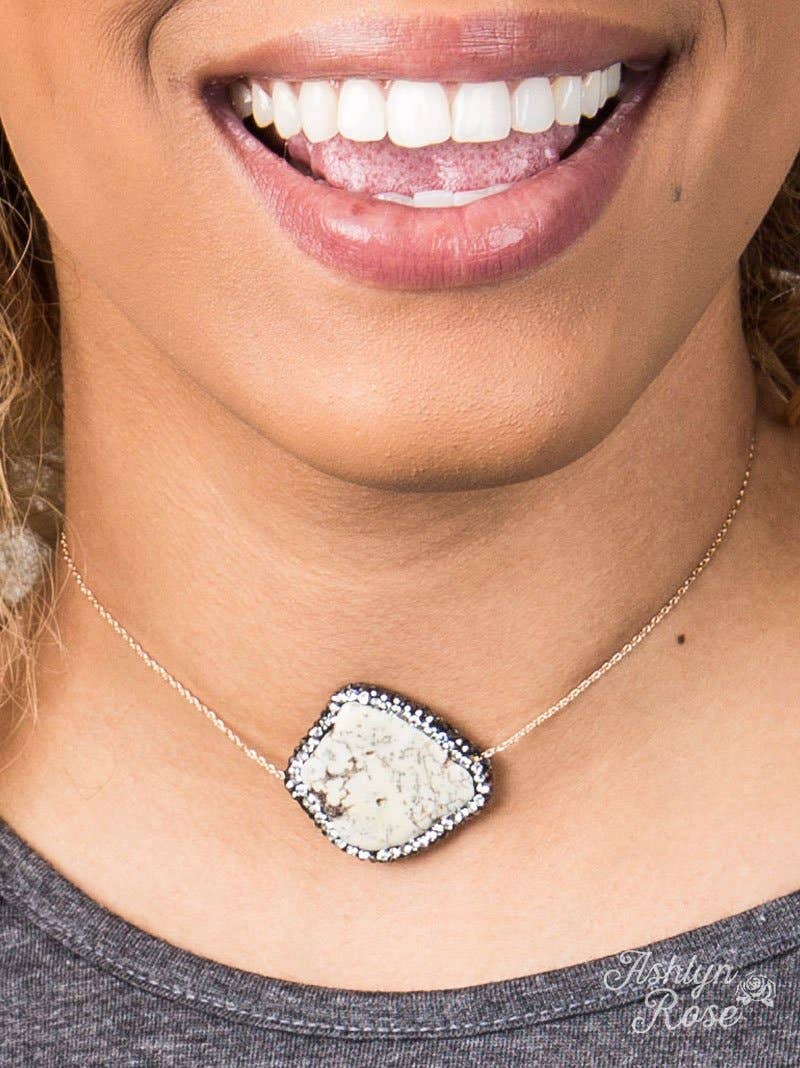 Introducing our Cream Stone Pendant with Clear Crystal Accents on Gold Chain Choker from the exclusive Ashlyn Rose Collection. This Pendant/Charm Necklace is a dazzling representation of the Southern Grace brand ethos - a blend of strength, love, and a dash of sass. Our pieces are not just jewelry, they're stories of strong Southern women. This necklace, with its cream stone pendant and clear crystal accents, is a testament to our commitment to quality and affordability. Wear it from a farm day to a fantastic night out, always feeling your best.