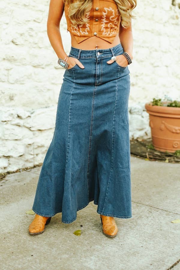 Denim stretch maxi skirt with ruffled hem and pockets. It can be accommodated with your favorite tops.