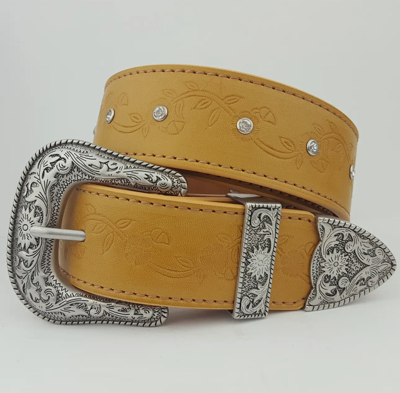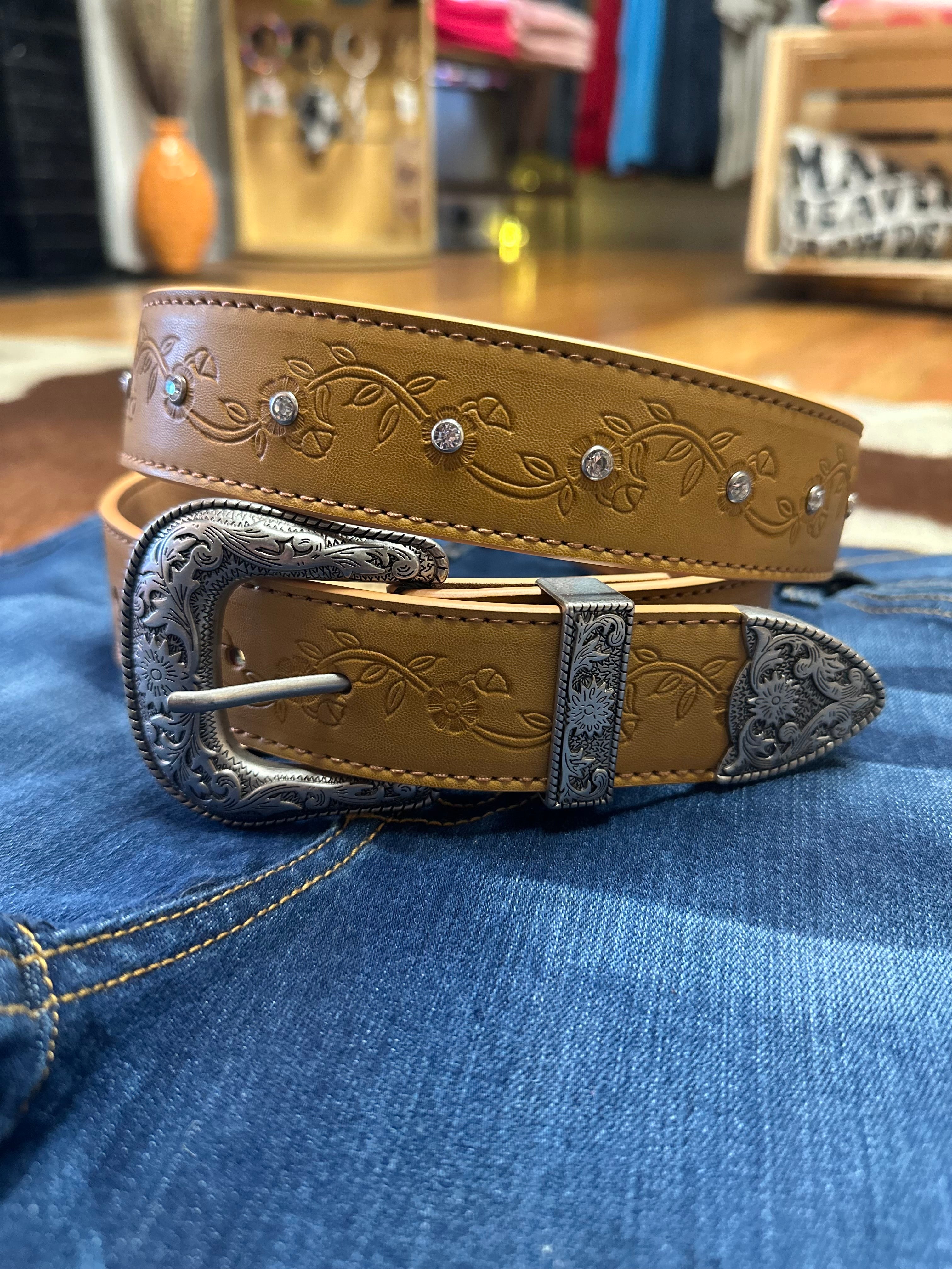 Western Vintage Silver Buckle Set with Floral Crystal Belt - Tan